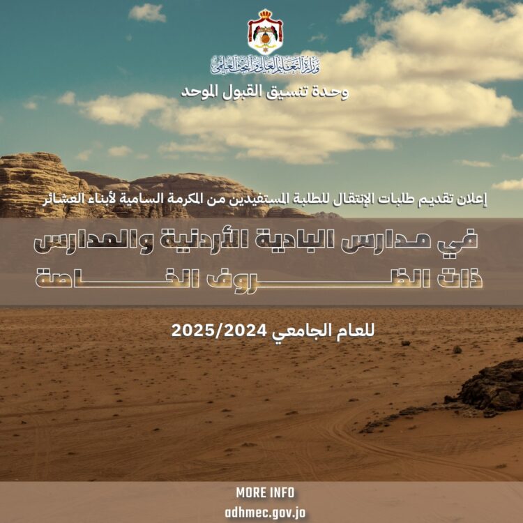 صدى الشعب – وحدة تنسيق القبول الموحد تعلن عن موعد تقديم طلبات الانتقال من تخصص إلى آخر أو من جامعة إلى أخرى للطلبة المستفيدين من مكرمة أبناء العشائر في مدارس البادية الأردنية والمدارس ذات الظروف الخاصة