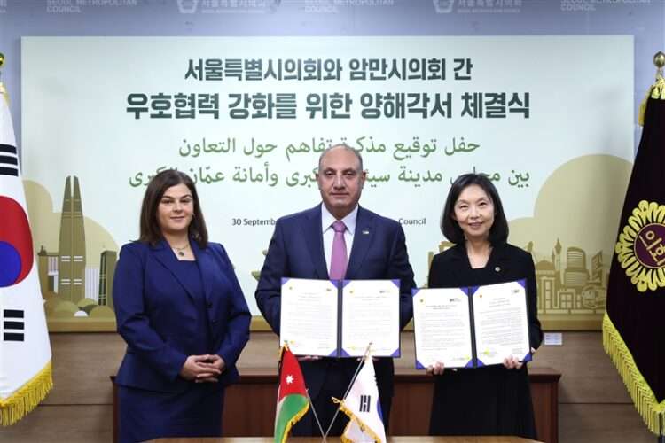 في خطوة عملية لترسيخ روح الشراكة و بناء جسور التعاون بين المدينتين في المجالات ذات الاهتمام المشترك وقع رئيس لجنة امانة عمان الكبرى الدكتور يوسف الشواربة، و رئيسة مجلس مدينة سيئول الكبرى هو جونغ تشوي، مذكرة تفاهم بين أمانة عمّان الكبرى ومجلس مدينة سيئول الكبرى في جمهورية كوريا، لتعزيز التعاون والعمل المشترك بين المدينتين.