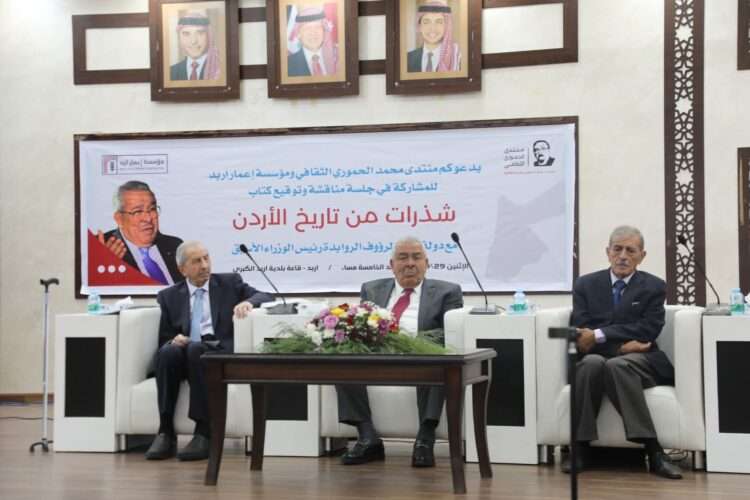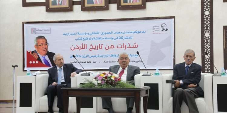 جاء ذلك خلال جلسة مناقشة وتوقيع كتابه الجديد “شذرات من تاريخ الأردن”، التي نظمتها مؤسسة إعمار إربد ومنتدى الدكتور محمد الحموري الثقافي، في قاعة بلدية إربد الكبرى، بحضور رئيس الوزراء الأسبق الدكتور بشر الخصاونة وعدد من الشخصيات السياسية والفكرية والثقافية.