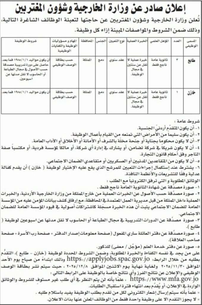 صدى الشعب - أعلنت وزارة الخارجية وشؤون المغتربين اليوم الأحد عن حاجتها لتعبئة الوظائف الشاغرة التالية، وذلك ضمن الشروط والمواصفات المبينة إزاء كل وظيفة: