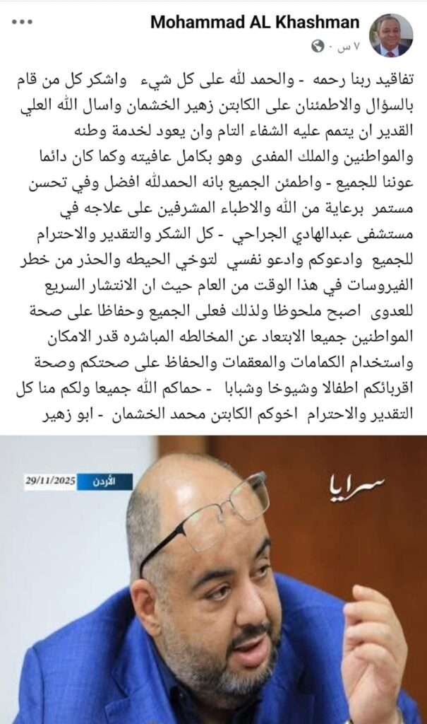 “تفاقيد ربنا رحمه – والحمد لله على كل شيء واشكر كل من قام بالسؤال والاطمئنان على الكابتن زهير الخشمان وأسأل الله العلي القدير ن يتمم عليه الشفاء التام وأن يعود لخدمة وطنه والمواطنين والملك المفدى وهو بكامل عافيته وكما كان دائماً عوننا للجميع – واطمئن الجميع بأنه الحمدلله أفضل وفي تحسن مستمر برعاية من الله والأطباء المشرفين على علاجه في مستشفى عبدالهادي الجراحي – كل الشكر والتقدير والاحترام للجميع وادعوكم وادعو نفسي لتوخي الحيطه والحذر من خطر الفيروسات في هذا الوقت من العام حيث أن الانتشار السريع للعدوى أصبح ملحوظاً ولذلك فعلى الجميع وحفاظاً على صحة المواطنين جميعاً الابتعاد عن المخالطه المباشره قدر الإمكان واستخدام الكمامات والمعقمات والحفاظ على صحتكم وصحة اقربائكم أطفالاً وشيوخاً وشباباً – حماكم الله جميعا ولكم منا كل التقدير والاحترام اخوكم الكابتن محمد الخشمان – أبو زهير”
