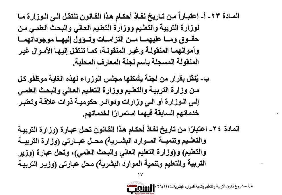 فهل هذا البند، يعني أن معظم العاملين بـ(التربية و التعليم و البحث العلمي) بمختلف فئاتهم سينتقلون لجهات أو وزارات أخرى، بنفس الامتيازات و ما كان ينطبق عليهم في وزارتهم حال إقرار القانون الجديد و المُسمى للوزارة؟