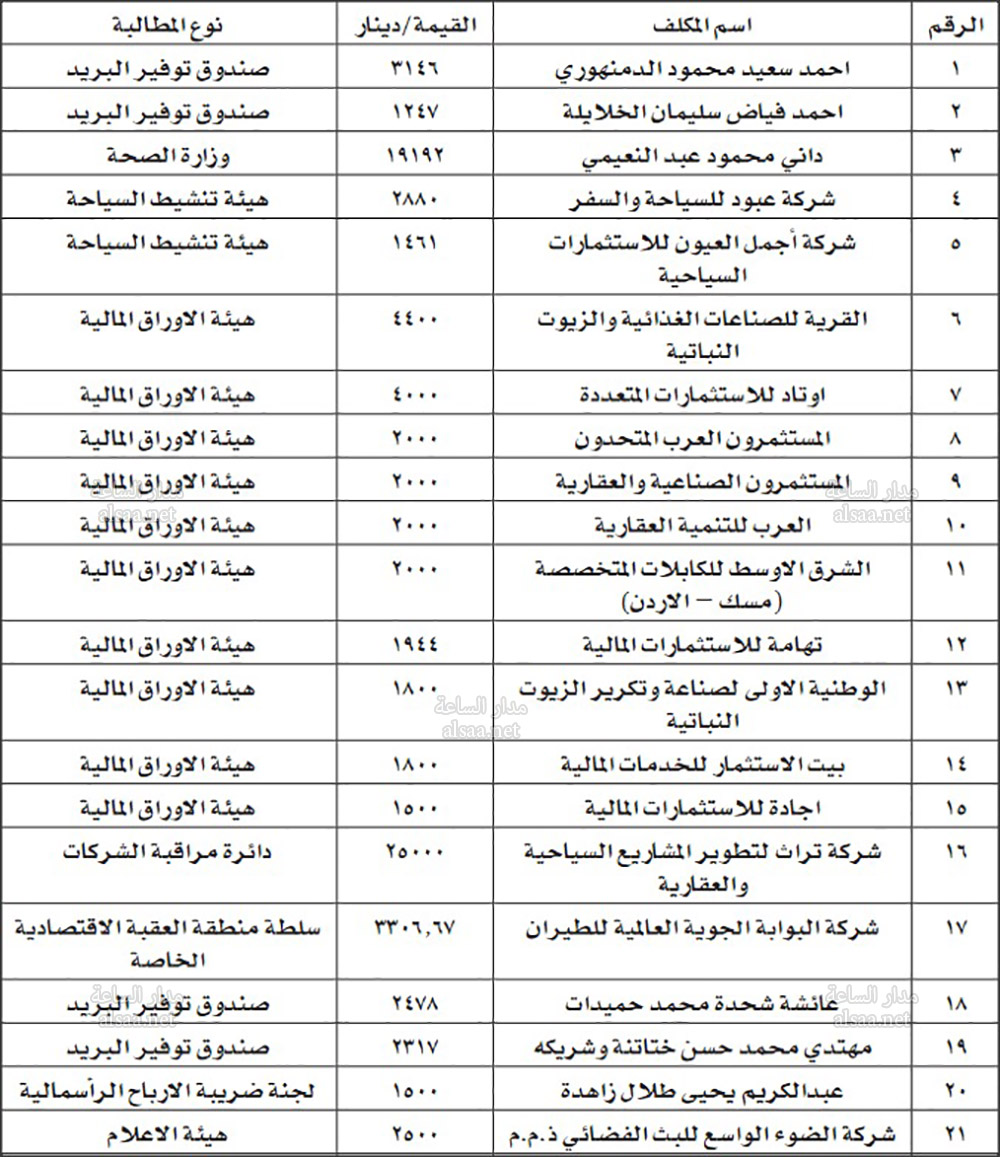صدى الشعب – طلبت وزارة المالية من المذكورين تالياً؛ دفع المبالغ المتحققة عليهم لحساب وزارة المالية – مديرية الاموال العامة تجنبا لاتخاذ الاجراءات القانونية اللازمة.