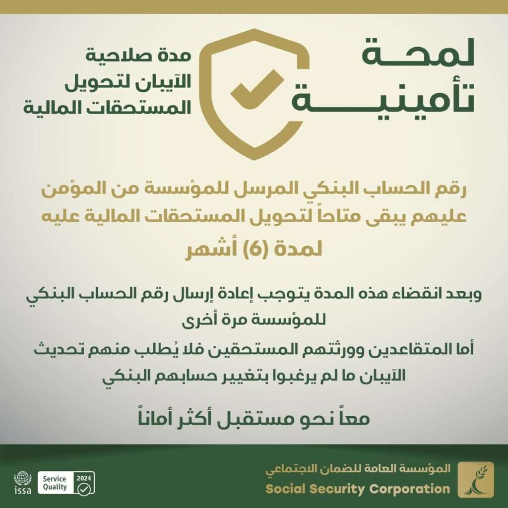 وبينت المؤسسة أن رقم الحساب البنكي الآيبان المُرسل لها يبقى صالحاً لمدة ستة أشهر فقط من تاريخ إرساله وبعد انقضاء هذه المدة يتوجب إعادة إرساله مرة أخرى لها.