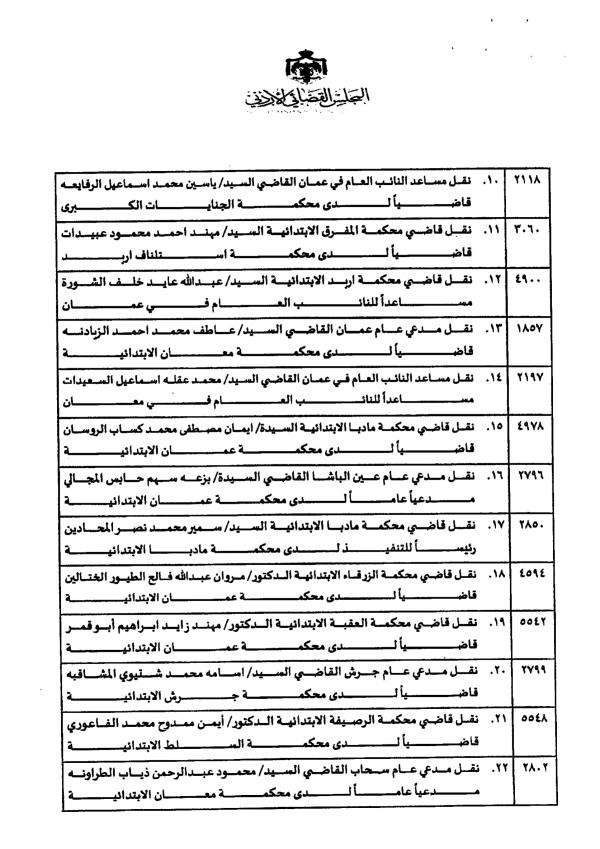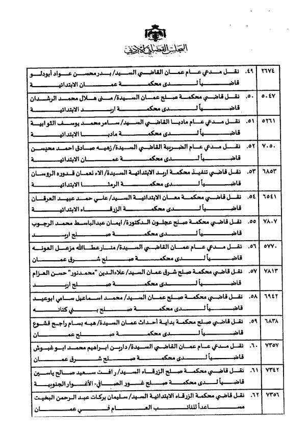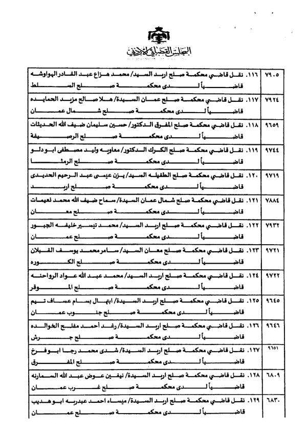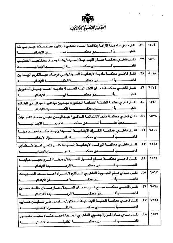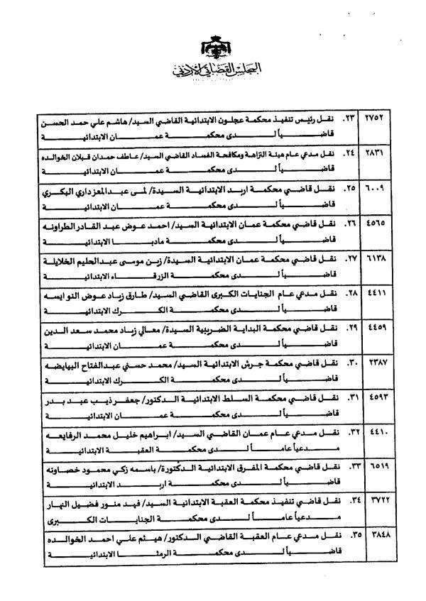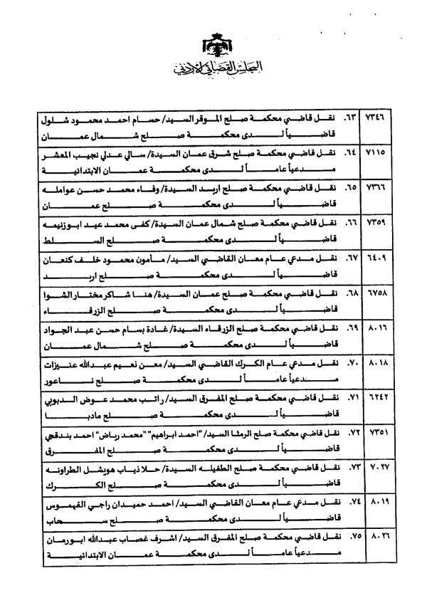 صدى الشعب - قرر المجلس القضائي، اليوم الخميس، إجراء عدد من التنقلات والتي شملت عدداً من القضاة العاملين في مختلف محاكم المملكة، وتالياً الأسماء: