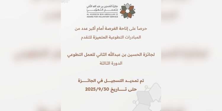 أعلنت لجنة إدارة جائزة الحسين بن عبدالله الثاني للعمل التطوعي، اليوم الأحد، عن تمديد فترة التسجيل في الجائزة بدورتها الثالثة حتى 30 من أيلول .