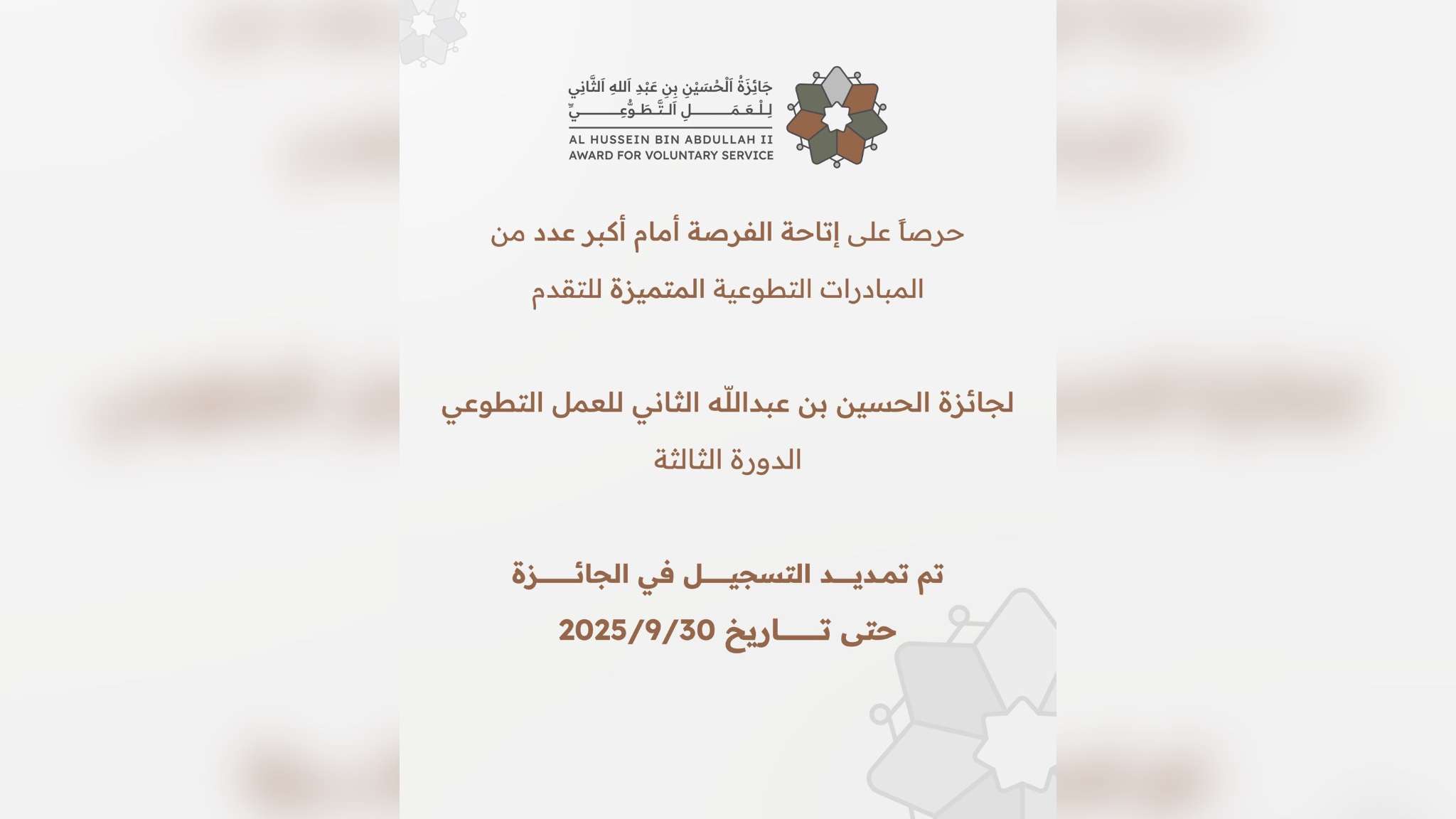 أعلنت لجنة إدارة جائزة الحسين بن عبدالله الثاني للعمل التطوعي، اليوم الأحد، عن تمديد فترة التسجيل في الجائزة بدورتها الثالثة حتى 30 من أيلول .