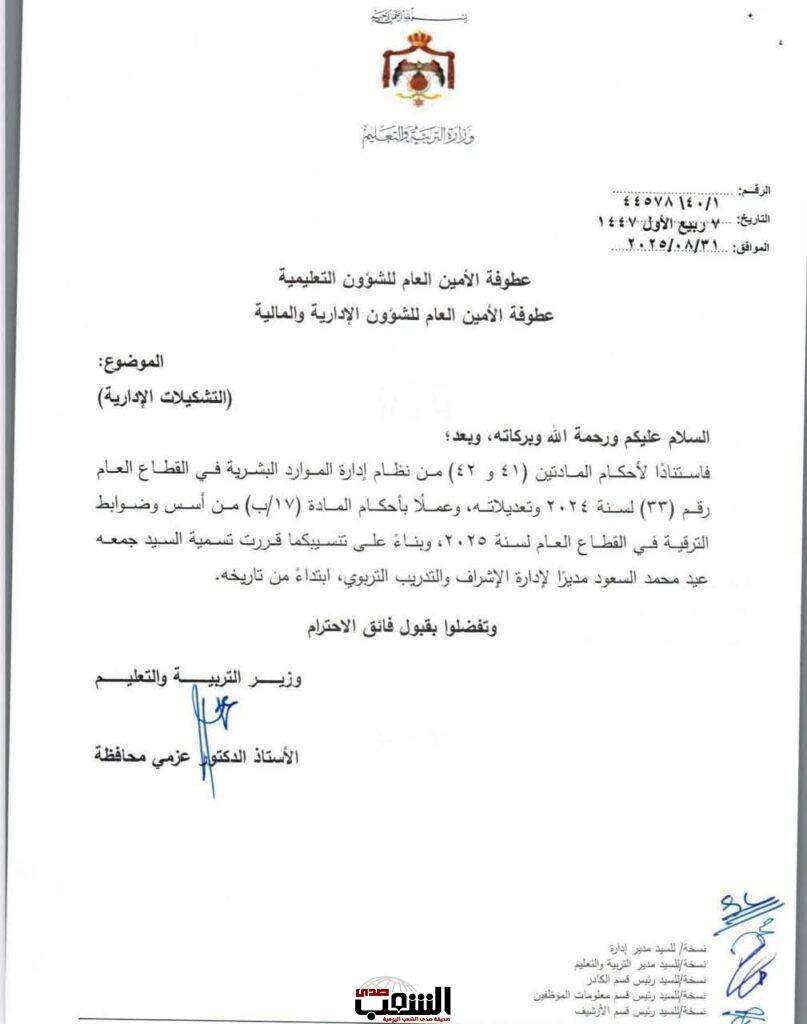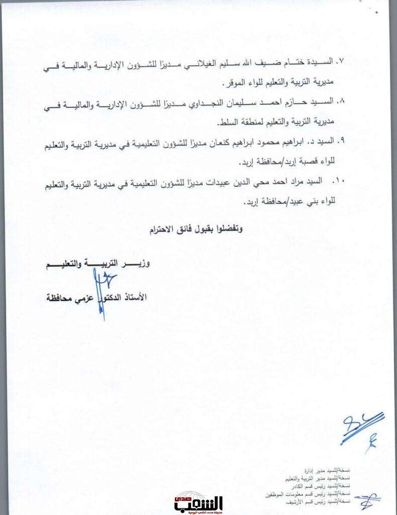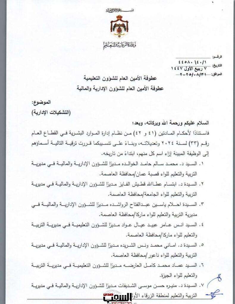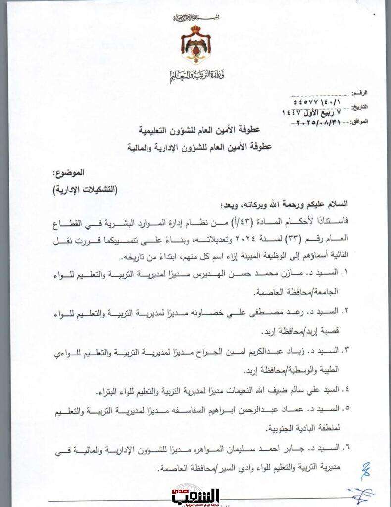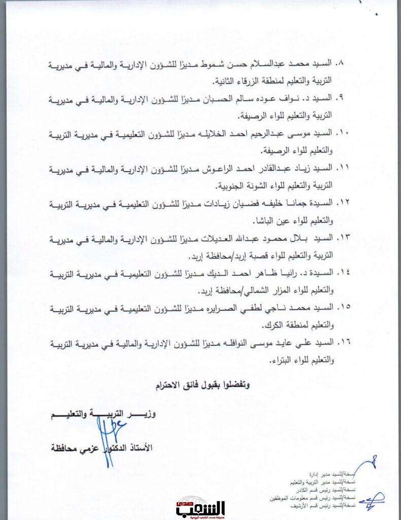 صدى الشعب – أجرى وزير التربية والتعليم، الأستاذ الدكتور عزمي محافظة اليوم الأحد، تشكيلات إدارية واسعة، شملت تعيين مدراء تربية جدد، إضافة إلى إقراره بإحداث ترقيات في دوائر أخرى، وجاءت القرارات على النحو التالي: