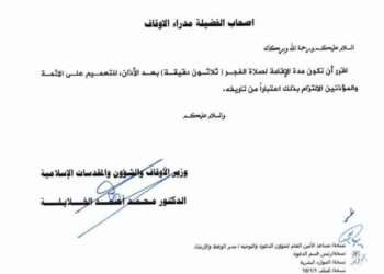 Read moreDetailsصدى الشعب - حددت وزارة الأوقاف والشؤون والمقدسات الإسلامية، مدة الانتظار بين آذان الفجر وإقامة الصلاة بـ 30 دقيقة. جاء...