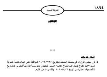 Read moreDetailsصدى الشعب - قرر مجلس الوزراء في جلسته المنعقدة بتاريخ 2025/3/25 الموافقة على إنهاء خدمة "عبد الفتاح جميل عبد الفتاح ...